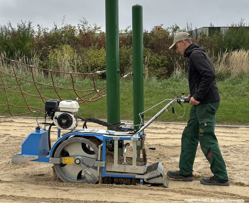Eine Maschine, etwa so groß wie eine Schubkarre, arbeitet sich durch den Sand auf dem Spielplatz am Ostseeküstenradweg. Bis zu 20 cm tief gräbt sie sich in den Spezialsand und siebt alles heraus, was nicht hineingehört: vom Stein über Unkraut bis hin zur Zigarettenkippe.